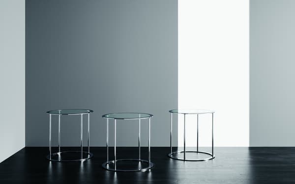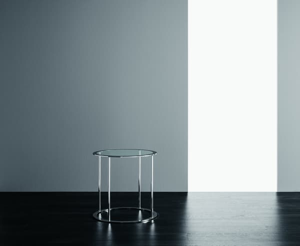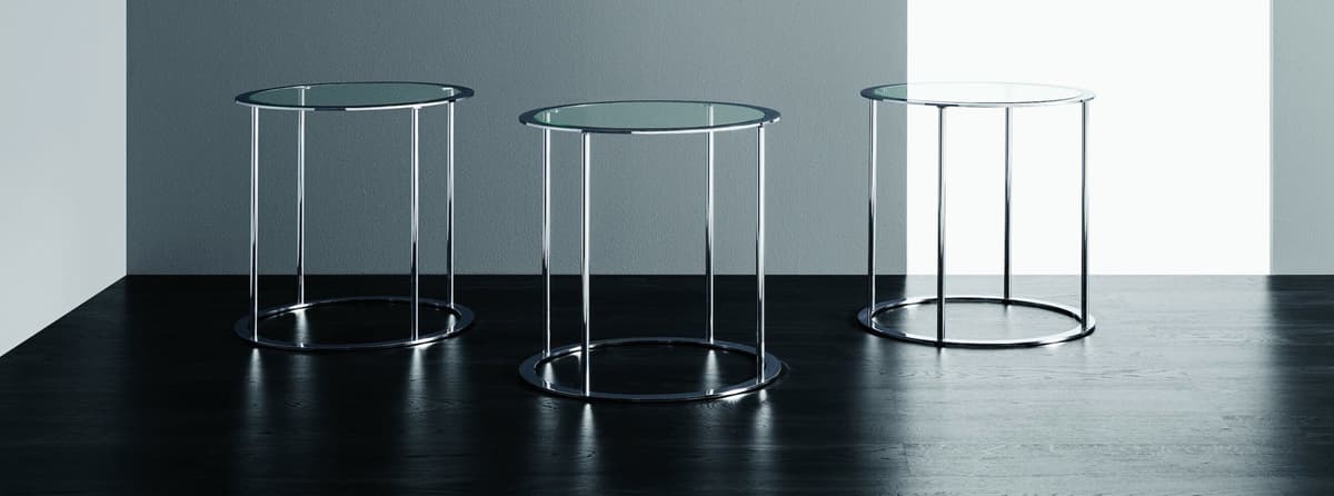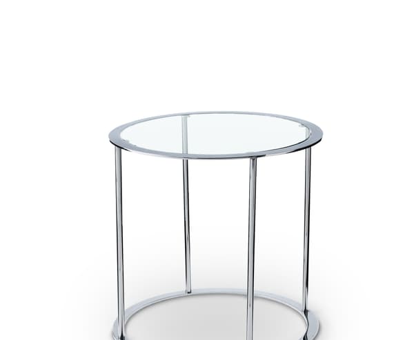 Sígilt, hringlaga borð, krómað og með glerplötu.