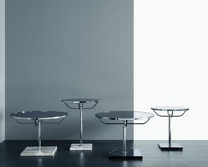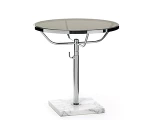 Sígilt, hringlaga borð, krómað með handvirkri hæðarstillingu og undirstöðu úr marmara.